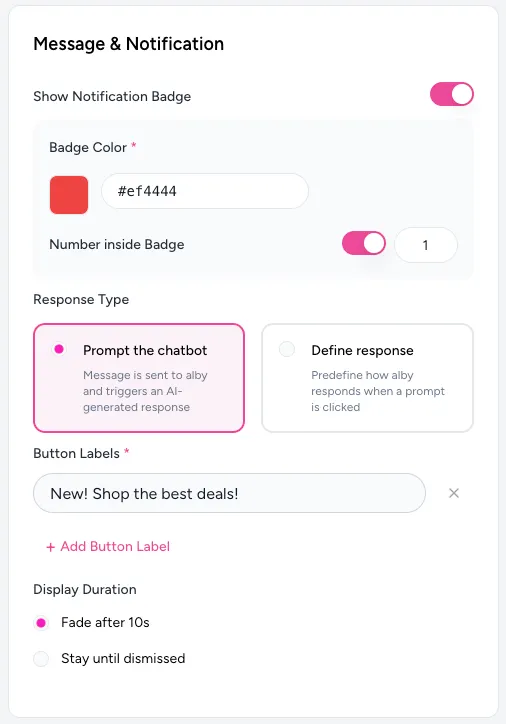 Outbound messages can help with relevant prompts, questions, or nudges that guide customers toward conversion. These messages are particularly valuable for brands that have already deployed the alby Chat experience and are looking to drive more interactions with their AI agent.